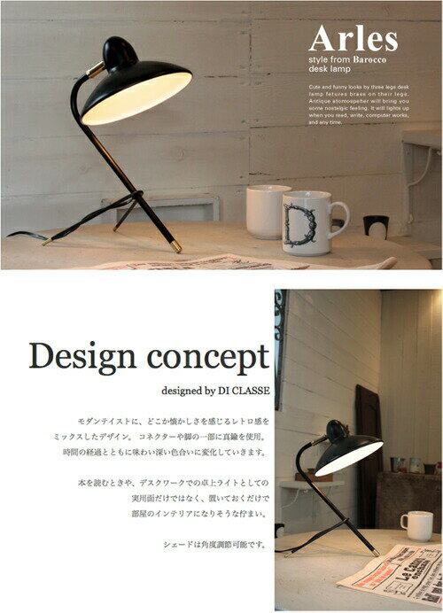商品名:品番:メーカー 【Arles:アルル】 【DI CLASSE:ディ クラッセ】 ■クラシカル・モダンなデザインのテーブルランプ 商品データ ■色:ホワイト・ブラック・センチュリーブルー センチュリーイエロー・ベリー・ミント ■素材:スチール、真鍮 ■サイズ:全体:W210×D240×H min360〜max440(mm) シェード:Φ200×110(mm)(※シェード可動式) ■電球:E-17 40W 白熱 レフ球 ※電球型蛍光灯は高さがあるためシェードから飛び出してしまう場合があります ■重量:0.6kg □スイッチ:ON/OFFスイッチ付 コメント モダンテイストに、どこか懐かしさを感じるレトロ感を ミックスしたデザイン。